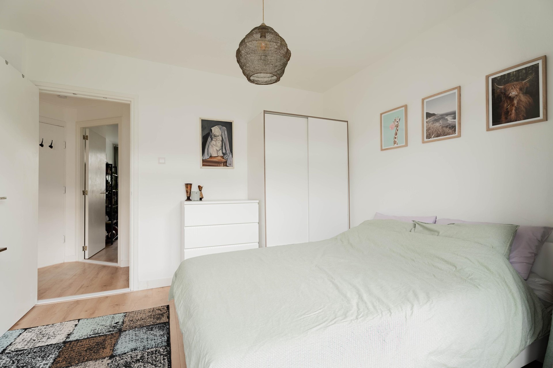 Aan de achterzijde van het appartement bevinden zich de ruime slaapkamer en de moderne keuken die voorzien is van diverse inbouwapparatuur zoals een 4-pits gasfornuis, koelkast en afzuigkap. Hier vind je ook de aansluiting voor de wasmachine. Zowel de keuken als de slaapkamer geven toegang tot het zonnige balkon op het westen, waar je van de middag- tot avondzon kunt genieten. Een fraaie houten vloer loopt door de gehele woning.