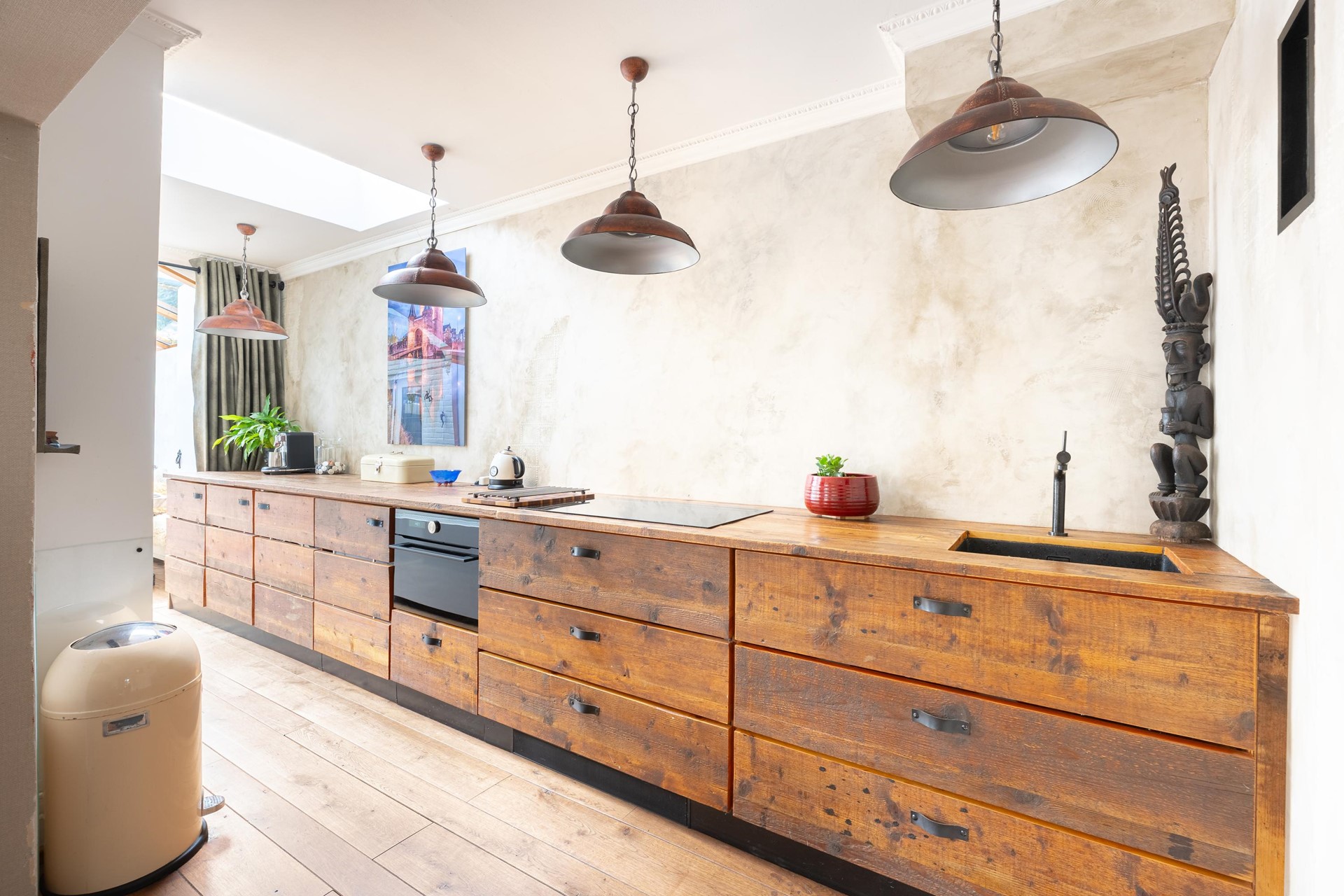 The spacious and bright living room features an authentic wood-burning stove and ample space for a cozy sitting area and dining area. French doors open onto the south-facing garden. The spacious kitchen is equipped with built-in appliances and offers ample workspace, offering every comfort for the home chef. There is also a spacious, naturally lit conservatory where you can relax and unwind.