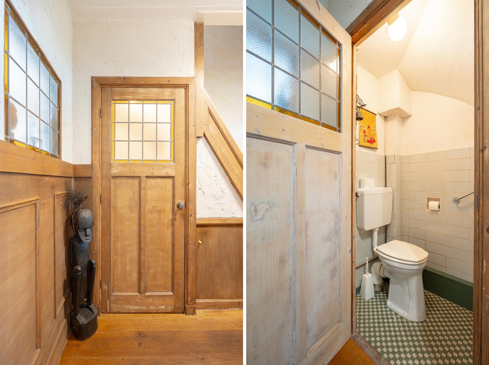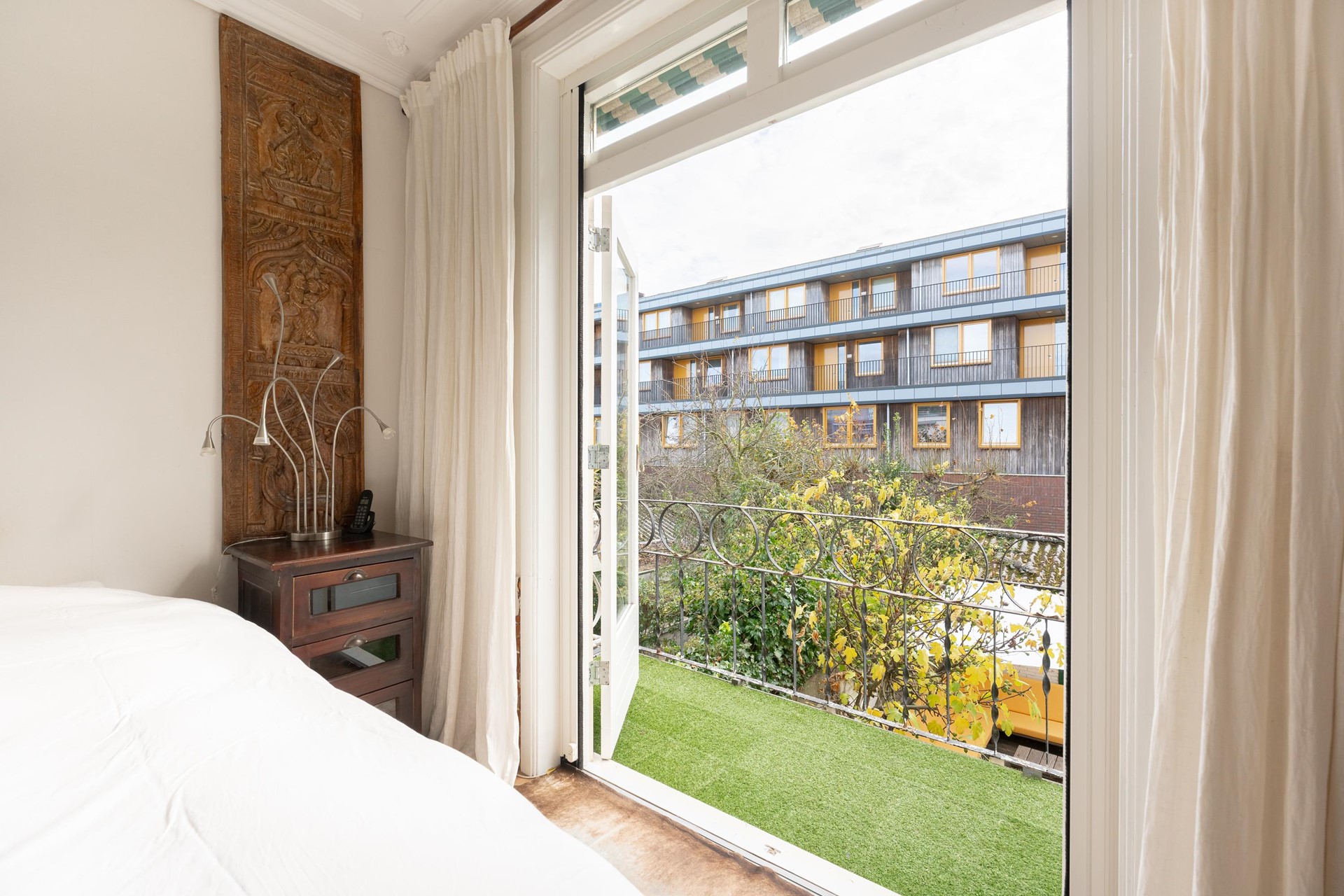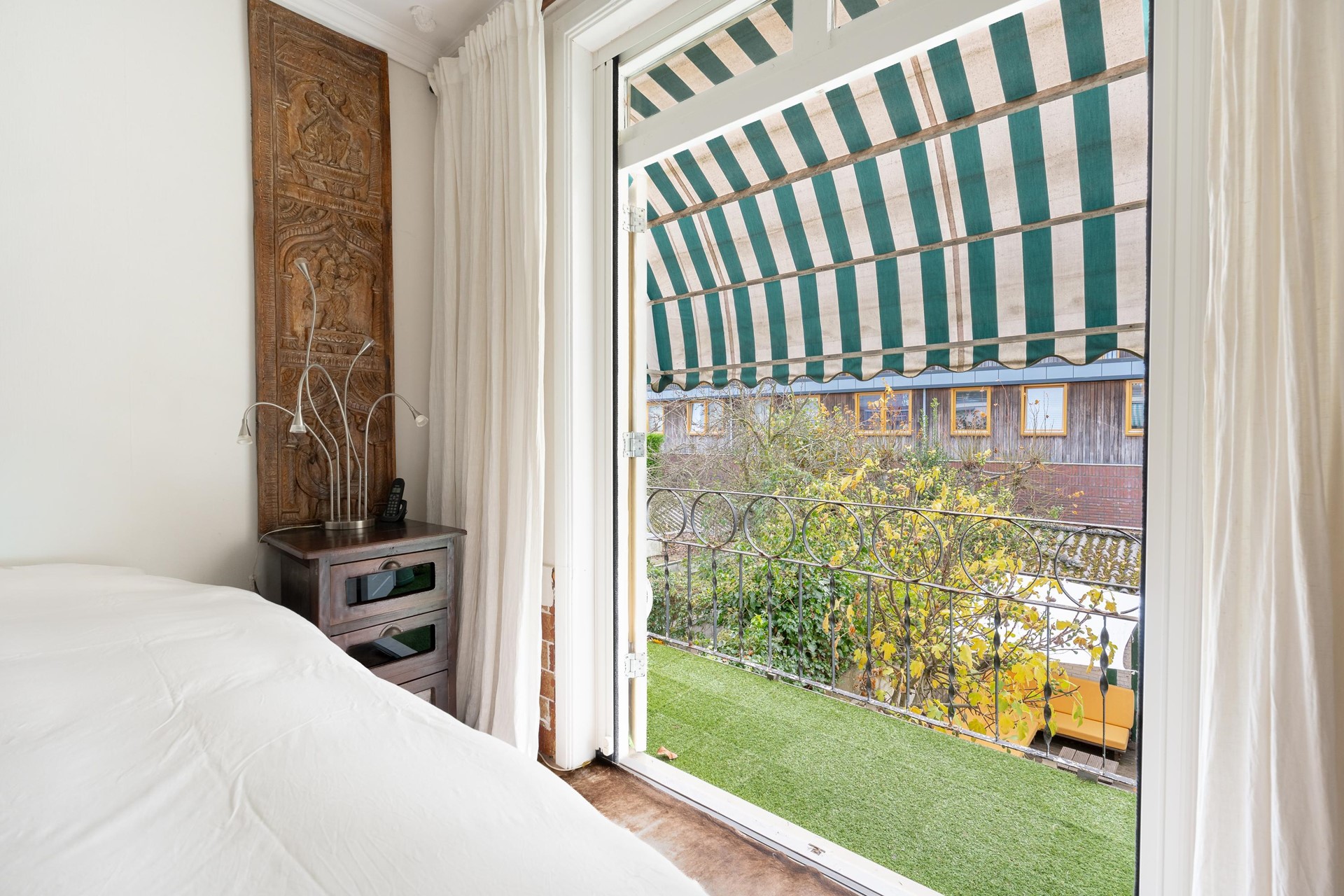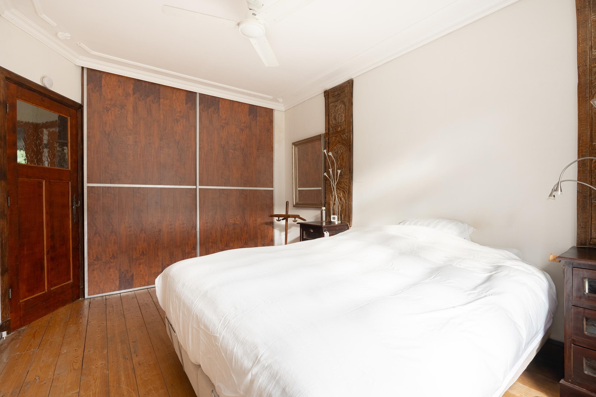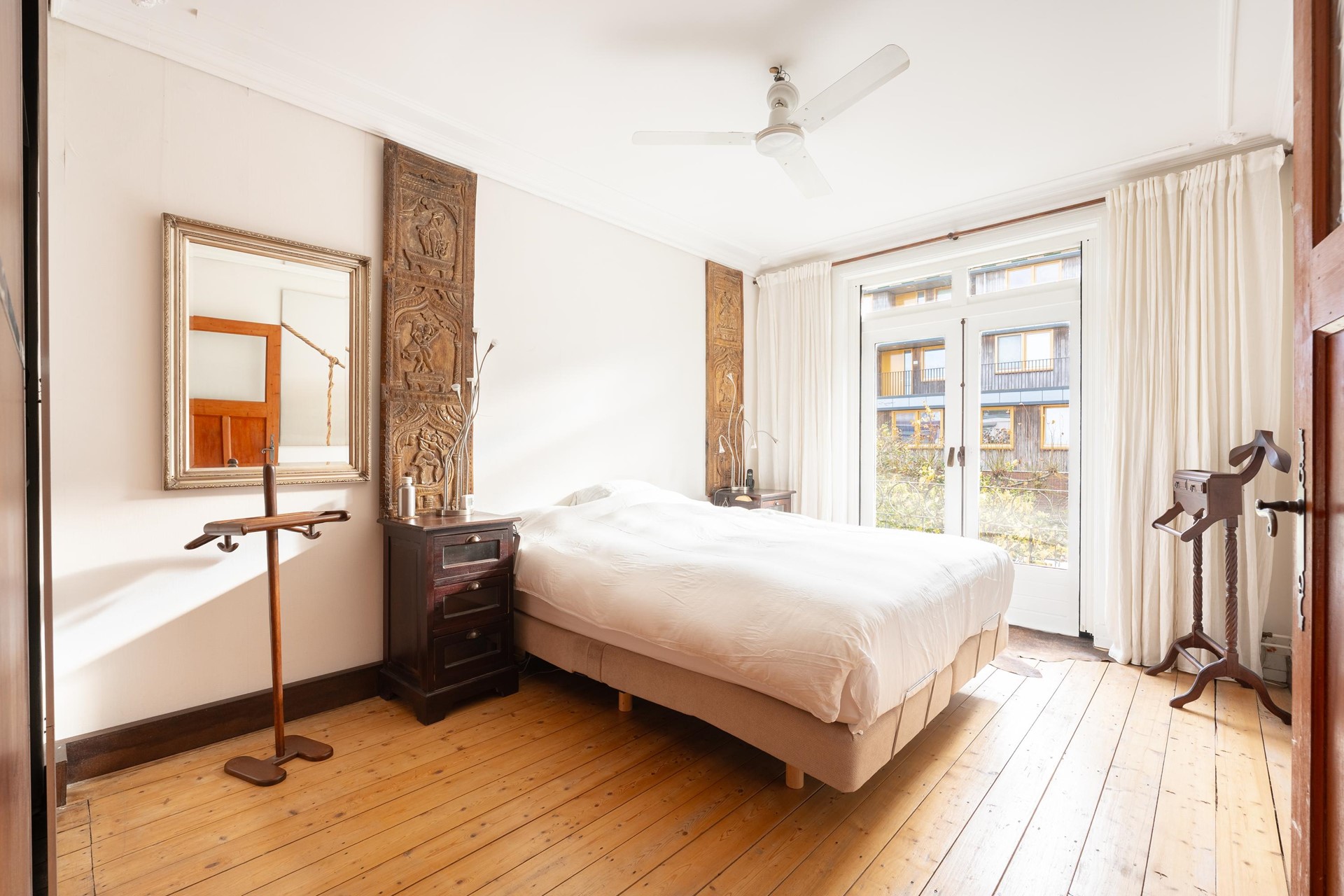 1e verdieping: Overloop, grote slaapkamer aan de voorzijde met een erker, slaapkamer met openslaande deuren naar het balkon, derde slaapkamer aan de voorzijde. Badkamer met douche, wastafelmeubel en 2e toilet.