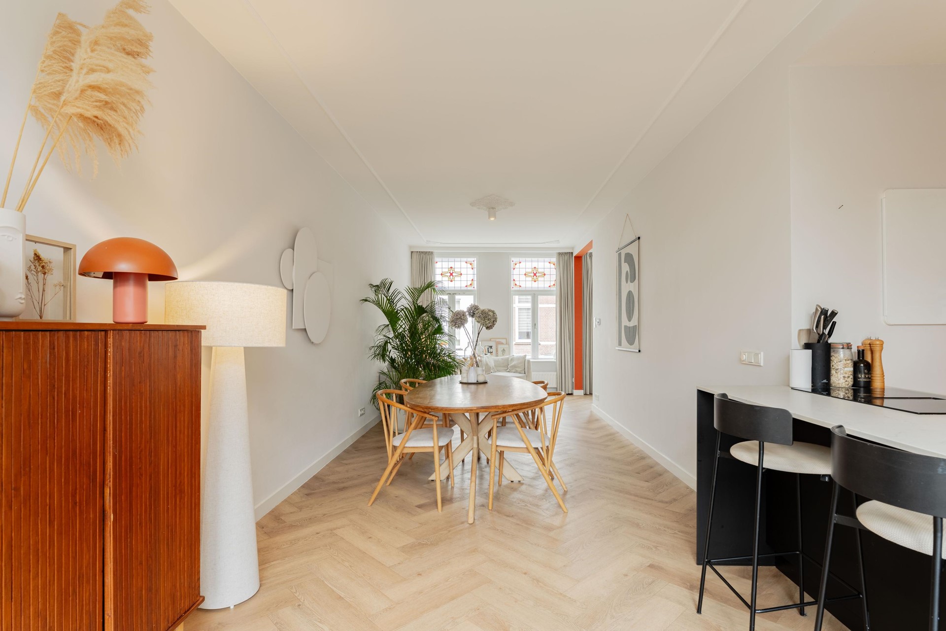 De woning heeft nog charmante authentieke elementen zoals glas in lood en ornamenten plafond met een hoogte van bijna 2,80 meter. Daarnaast heeft de woning een mooie visgraat gelegde pvc vloer en diverse inbouwspots.