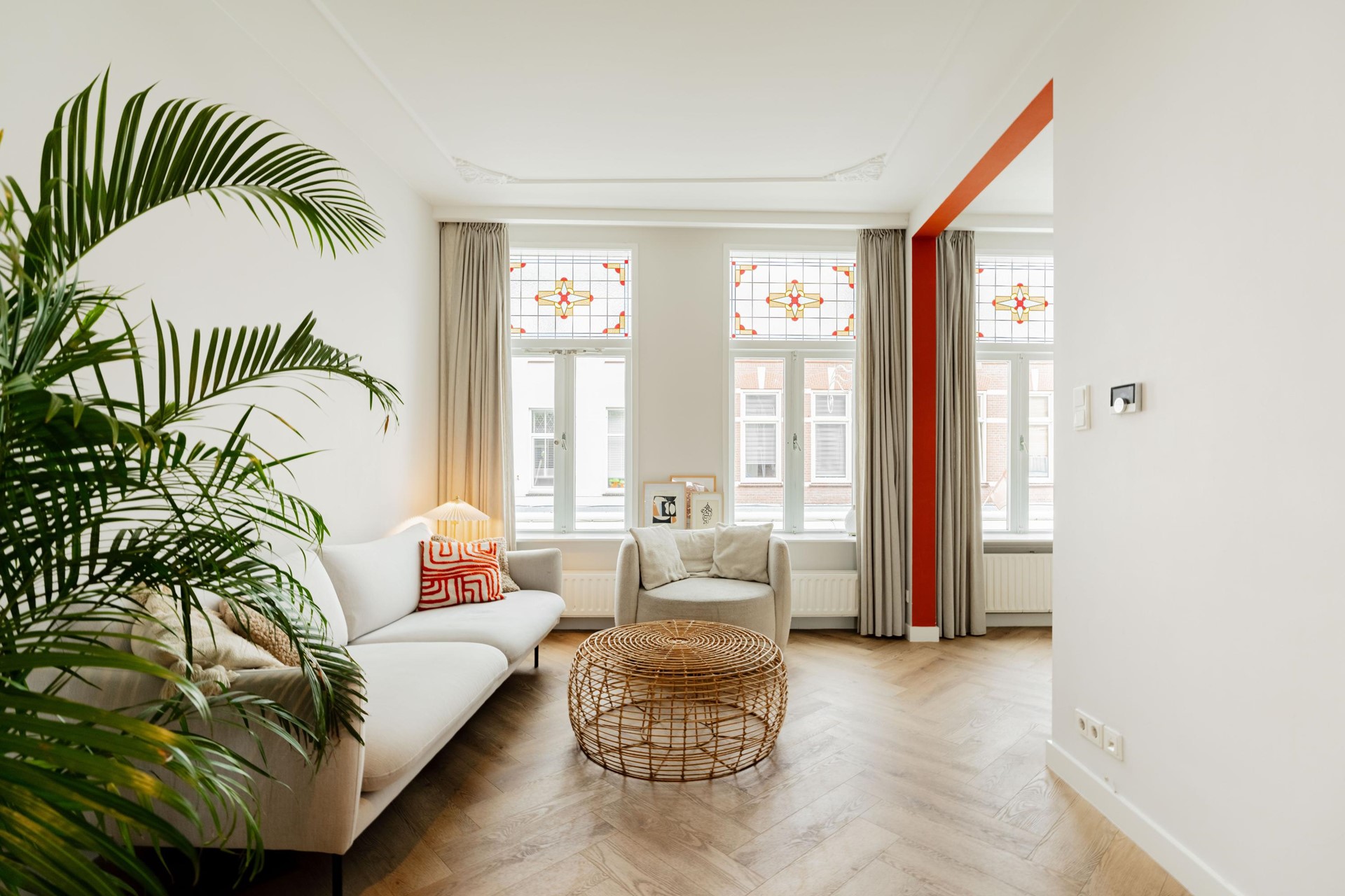 The apartment still boasts charming original features such as stained glass and an ornate ceiling with a height of almost 2.8 meters. It also features a beautiful herringbone patterned PVC floor and various recessed spotlights.